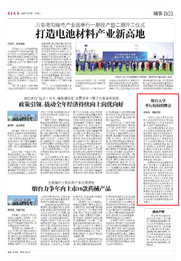《齐鲁晚报》3月31日B03版刊发《烟台大学举行校园招聘会》
