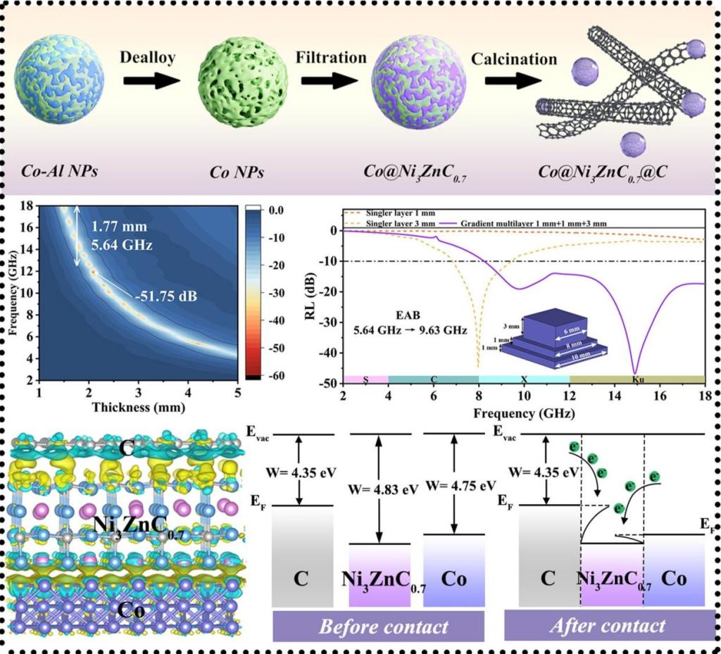 构建内建电场已被证明是一种通过增强界面极化来改善介电损耗机制的有效策略。该研究通过氢等离子体-金属反应、脱合金、真空过滤及后续煅烧的工艺,成功合成了一种多壳层异质结构的Co/Ni3ZnC0.7/C复合材料。Ni3ZnC0.7与Co的比例调控着材料的导电性和石墨化程度。第一性原理计算直观展示了空间电荷在多重异质界面上的定向迁移行为。组分间的功函数差异会自发形成内建电场结构,从而显著增强电磁极化损耗与电磁波吸收能力。该复合材料展现出卓越的性能,实现了-51.75 dB的最小反射损耗以及5.64 GHz的有效吸收带宽,梯度多层结构设计更将有效吸收带宽拓宽至9.63 GHz,加之其优异的隔热性能和低红外可视性,显著提升了材料的实际应用潜力。这种将Ni3ZnC0.7负载于孔隙内部与表面的多壳层结构设计,为开发高性能异质界面内建电场型宽带电磁波吸收材料提供了新的思路。