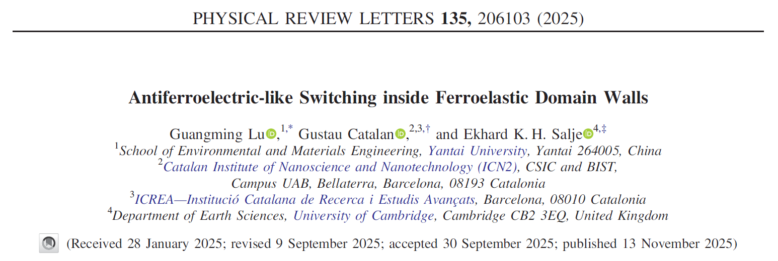 2025年11月13日,烟台大学环境与材料工程学院青年教师卢广明联合加泰罗尼亚纳米科技研究所Gustau Catalan教授及剑桥大学地球科学系Ekhard K. H. Salje教授于国际顶级学术期刊《Physical Review Letters》(PRL)发表重要研究成果—《Antiferroelectric-like Switching inside Ferroelastic Domain Walls》,该研究首次揭示极性铁弹畴界反铁电式翻转行为,拓宽了传统铁弹材料的功能性应用范围,对新型纳米畴界器件的开发及研制有重要理论价值。