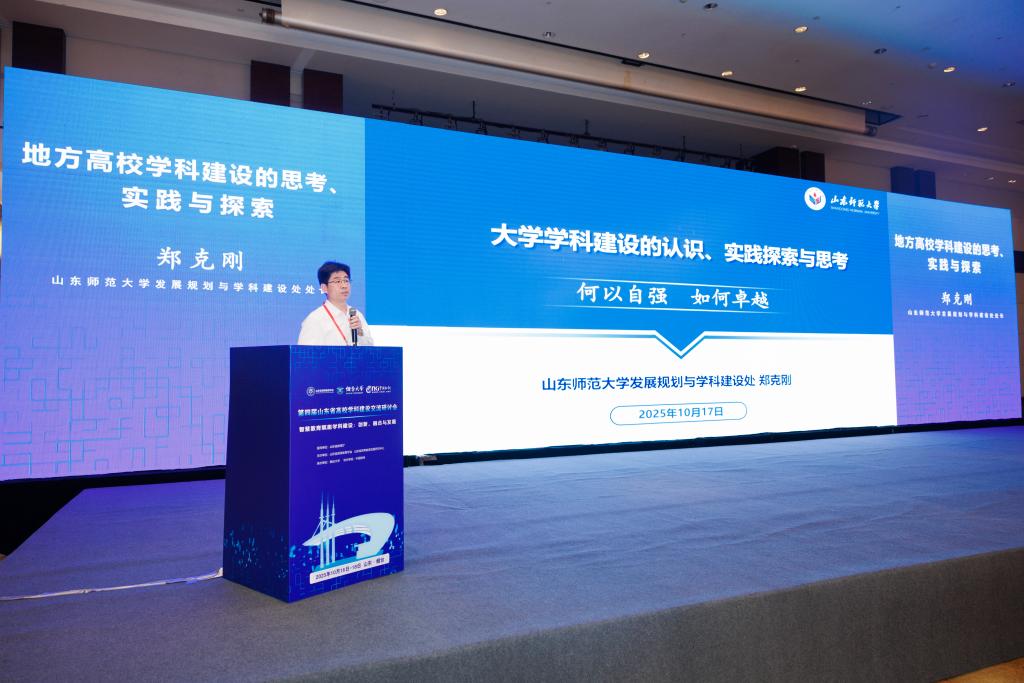 宋承祥在致辞中阐述了“超常规”“自主双一流标准”“人工智能+”三大关键词对未来学科建设的影响。同时提出以“破立结合”重塑学科建设新范式,即破“路径依赖”立“需求牵引”、破“单兵作战”立“融合共生”、破“评价固化”立“动态多元标准”。他表示,期望与会者以此次研讨会为契机,解放思想、守正创新,探索学科建设的山东路径,为教育强国建设贡献“山东力量”。