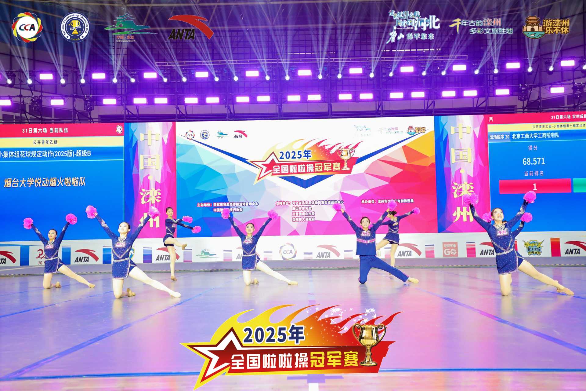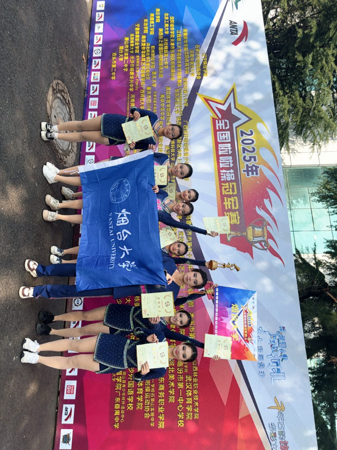 本次赛事吸引了来自全国26个省、自治区、直辖市的225支参赛队伍,共计6400余名运动员参加。比赛期间,各代表队围绕技术技巧、动作创编、团队协作等方面展开激烈角逐。技巧啦啦操整齐有力、气势如虹,舞蹈啦啦操编排新颖、艺术表现力强,全面呈现了啦啦操运动力与美融合的独特魅力。我校“悦动烟火”啦啦队在啦啦操协会指导教师王英的带领下,参加了运动员技术星级组集体花球自选动作和公开青年乙组小集体花球规定动作(2025版)-超级B两个项目的比赛。在与首都体育学院、武汉体育学院、河海大学等高水平院校的同场竞技中,队员们不仅积累了宝贵经验,更展现了烟大学子的卓越风采。