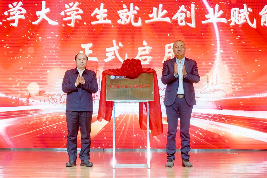党委副书记、校长郝曙光,烟台市人力资源和社会保障局党组成员、副局长宋军明为“烟台大学大学生就业创业赋能中心”揭牌
