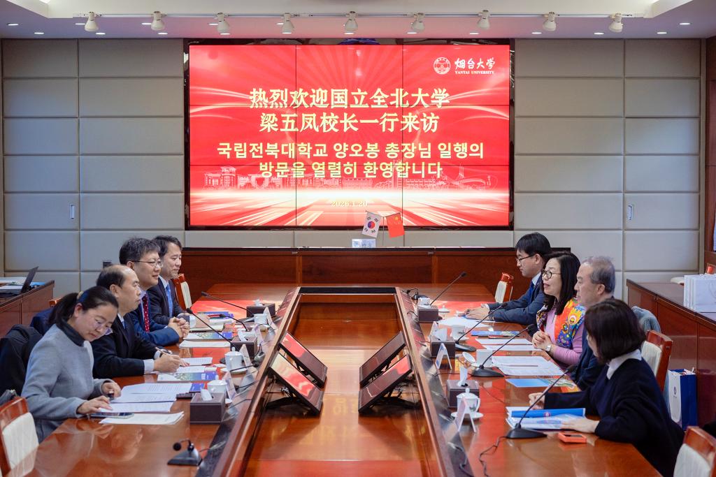 郝曙光对梁五凤一行来访表示热烈欢迎,并介绍了烟台大学基本情况和国际化办学特色。他表示,烟台地处中韩交流前沿,拥有独特的地缘优势,烟台大学与韩国高校合作起步早、交流深、领域广、成效好,在对韩高等教育交流领域具有较大影响力。烟台大学与国立全北大学自2013年建立合作关系以来,开展了卓有成效的交流互动,百余名学生参加了校际交流项目,两校在人工智能、生物制药、绿色产业等新兴领域具有很大合作潜力。希望以此次梁五凤校长来访为契机,加快中外合作办学项目推进速度,力争尽早获批。两校要持续深化合作,提升人才培养国际化水平,促进两国高等教育合作。