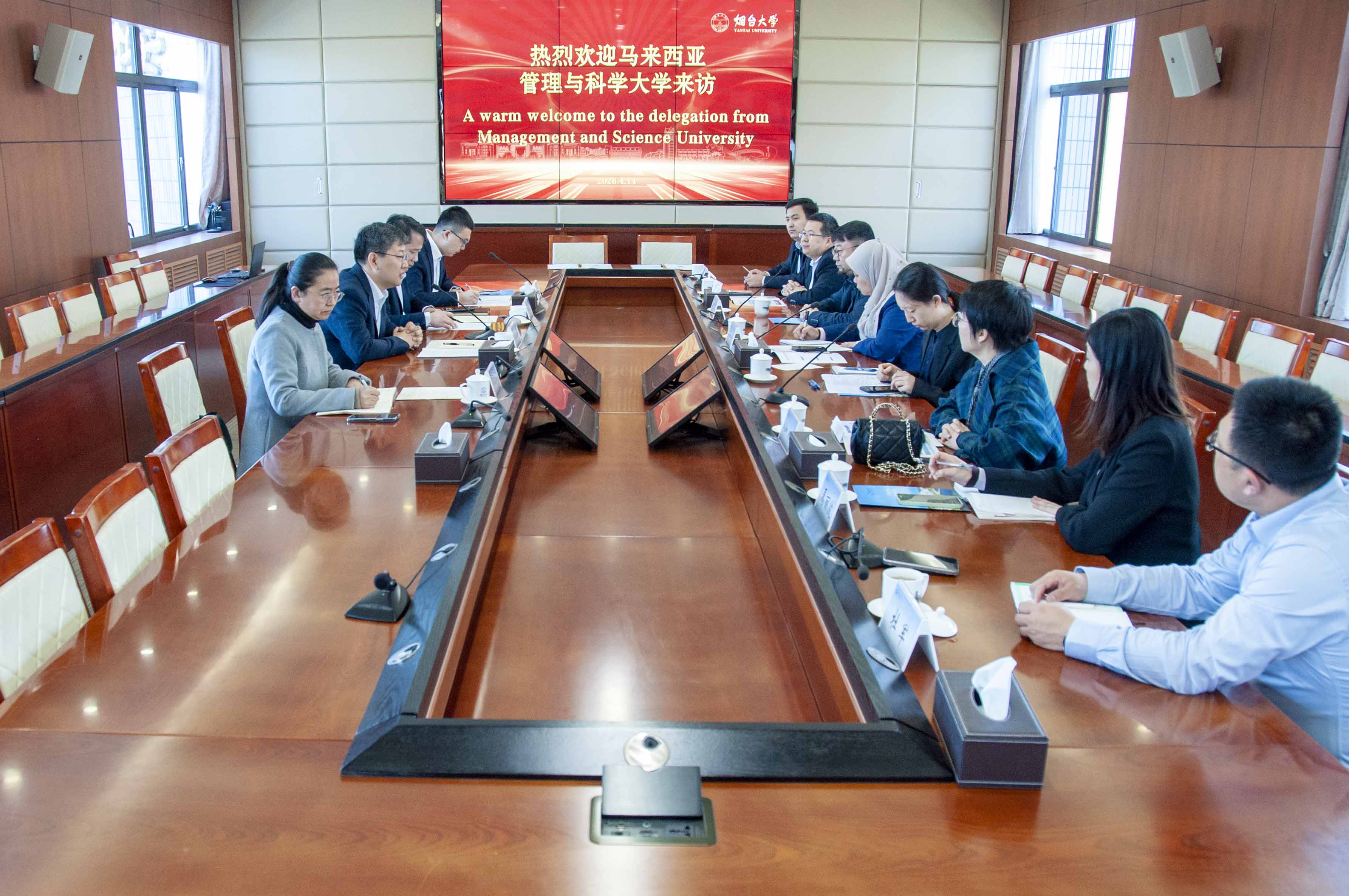 王洪波对英丹·艾瑞缇·艾瑞芬尼一行表示欢迎,并介绍了烟台大学的发展历程、学科发展特色以及国际化办学成果。他表示,烟台大学与马来西亚高校交流成效显著,已开展免学费学生交换、教师互访等活动,希望以此次访问为契机,开启与马来西亚管理与科学大学在师生互访、共建联合实验室、博士联合培养等方面的项目合作,推动两校友好关系走深走实,深化与“一带一路”沿线国家的教育合作。